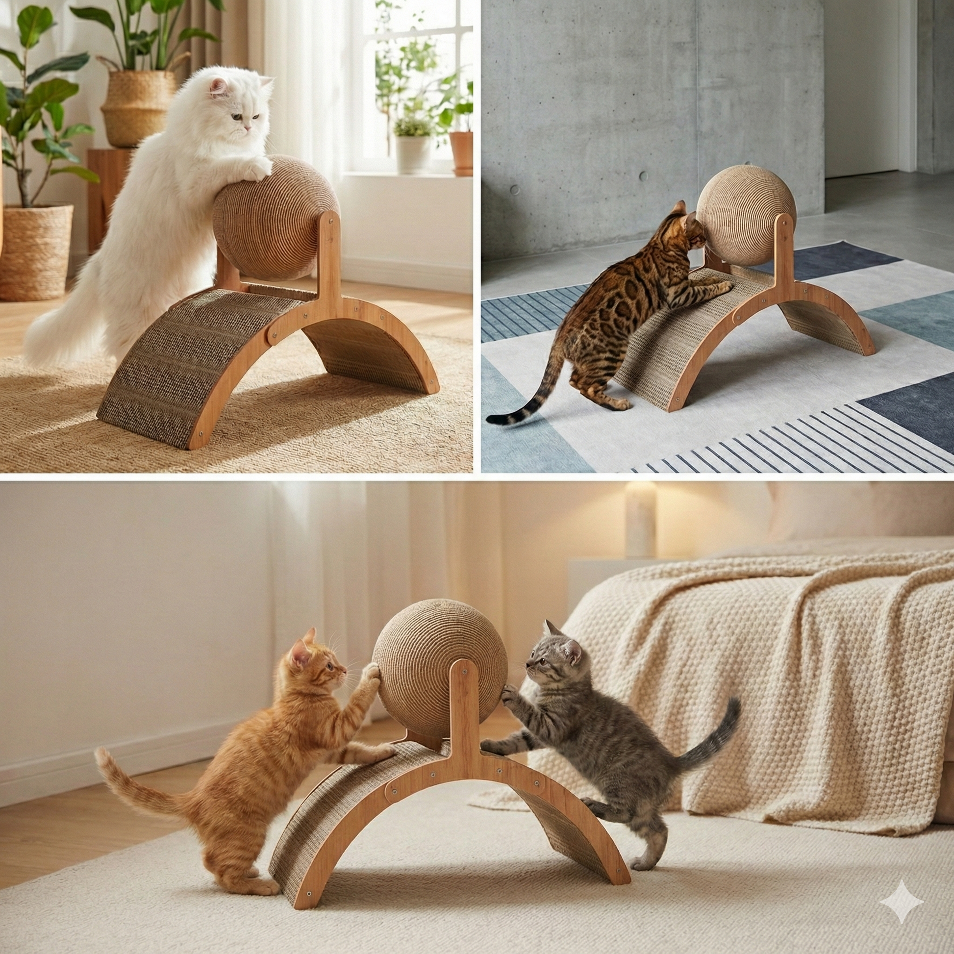Why Your Cat Will Love It: Whether they want to lazily lounge on the arch, aggressively sharpen their claws, or bat the ball around in a fit of "zoomies," this scratcher adapts to their mood. It’s the perfect addition to any modern home, blending natural wood tones with functional pet care.
